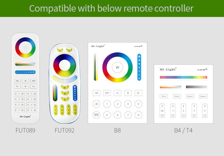 8 zones RGB+CCT remote controltouch remote control RGB color wheel dimmer slide + color mixing slider on/off and program and speed button 8 zone buttons requires 2 AAA batteries, not included Lieske Part No.: 1044801 Mfg Part No: FUT089 |