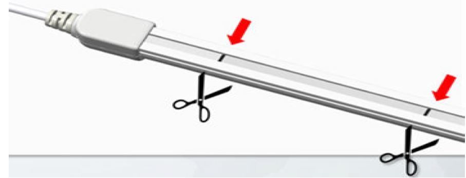 Strip can be shortened at the cutting marks with sharp scissors. !Danger! Strip must first be checked for functionality. Only share the strip when there is no power.