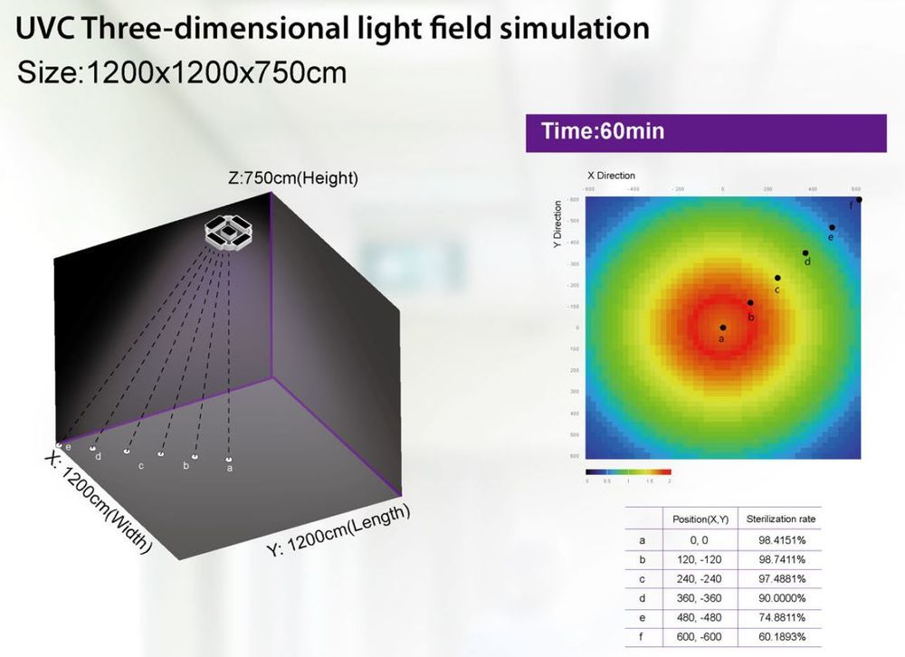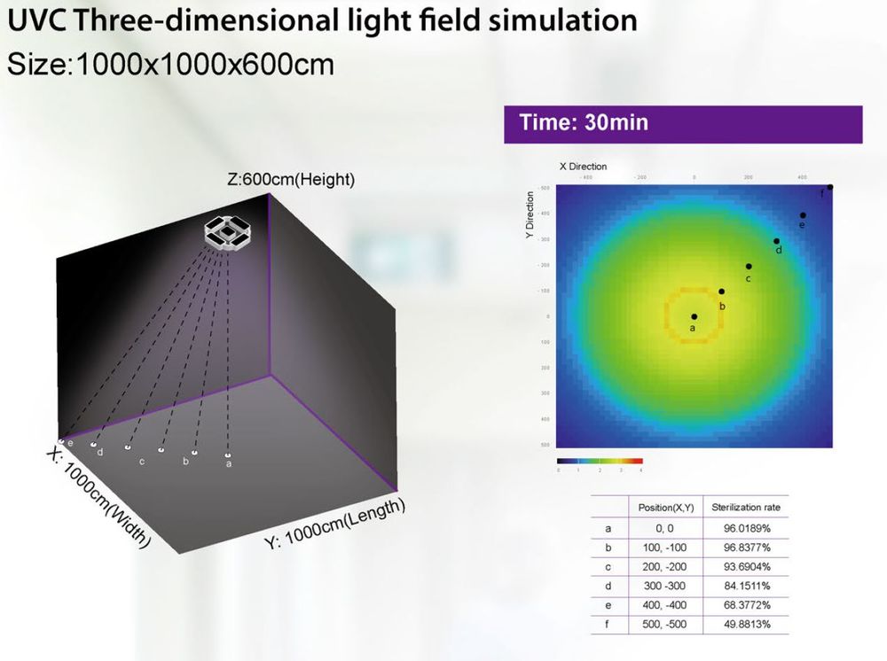 Operating voltage: 180~240VAC< Input Watt: 200W LED: 275NM-UVC Power supply: MeanWell Beam angle: Lens 120° Light color: 275NM-UVC Housing: Aluminum Working temperature: -40°C to +40°C Dimensions: 429*429*159mm