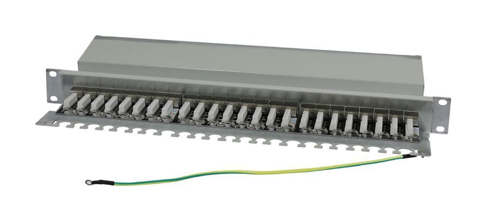 The article Patch Panel 24xTP, CAT6A, 500Mhz, 48,3 cm ( 19 inch ), light grey LSA, Synergy 21, is currently in stock
