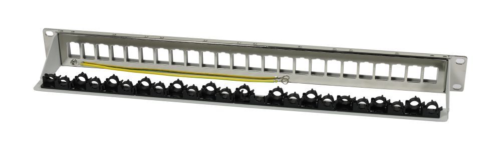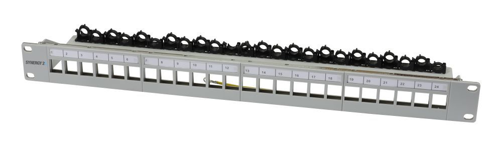 Patch Panel 24xTP-TP(Kupplung),CAT6A, incl.Keystone Slim-line, 48,3 cm ( 19 inch ), 1HE(t 94mm) mit Kabelklemme, Lichtgrau, Synergy 21,