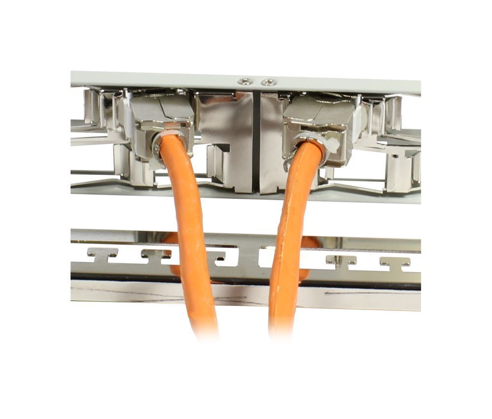 The article Keystone, module carrier, 48,3 cm ( 19 inch ) patch panel for 24xTP module, 1U (t 96mm) 45 degree slanted outlet, light gray, Synergy 21 is currently in stock