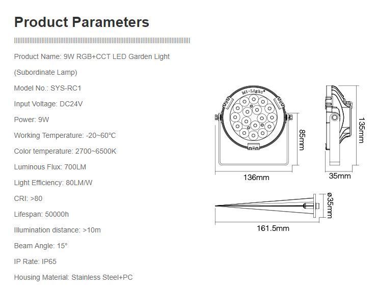 Product Name: 15W RGB+CCT LED Garden Light (Subordinate Lamp) Model No.: SYS-RC2 Input Voltage: DC24V Power: 15W Working Temperature: -20~60? Color temperature: 2700~6500K Luminous Flux: 1200LM Light ...Lieske Part No.: 1376003 Mfg Part No: SYS-RC2 |