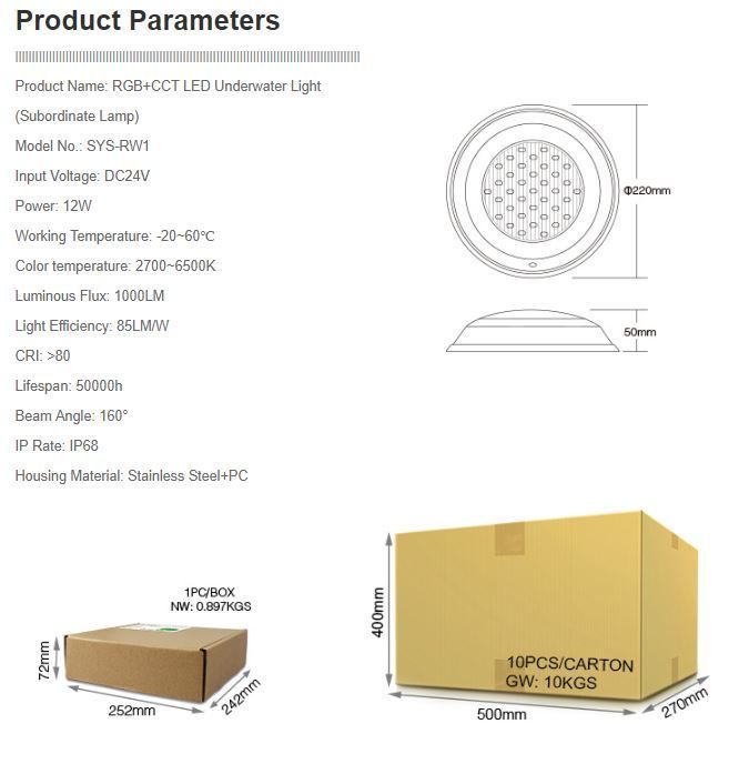 Product Name: 5W RGB+CCT LED Underground Light(Subordinate Lamp) Model No.: SYS-RD1 Input Voltage: DC24V Power: 5W Working Temperature: -20~60° Color temperature: 2700~6500K Luminous Flux: 350LM ... Lieske Part No.: 1165991 Mfg Part No: SYS-RD1 |