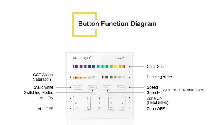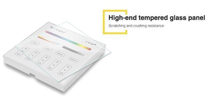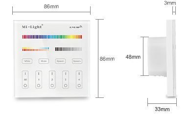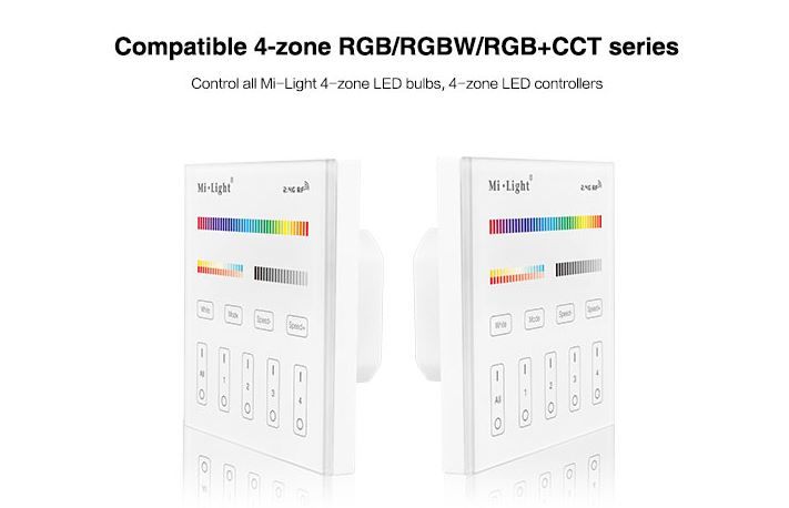 Product Name: 4-Zone RGB+CCT Smart Panel Remote Controller Model No.: T4 Working Temperature: -20 -60°C Voltage: AC90~110V or AC180~240V Transmission Frequency: 2400-2483.5 MHz Modulation Method: GFSK Transmitting Power: 6dBm Control Distance: 30m Panel Size: 86*86mm