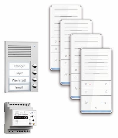 audio:pack PAAF041/001 for 4 residential units, Article number: PAAF041/001, Package description, audio:pack for 4 residential units, indoor station for hands-free calling, outdoor station for surface mounting, pre-configured TCS system components, Scope of delivery, 1x outdoor station PAK03-EN, 4x hands-free speakers ISW5031-0145, 1x control unit BVS20-SG, hands-free speakers ISW5031-0145, Product features, Device type: TASTA hands-free speaker AUDIO PLUS WS, Communication technology: TCS:BUS and video 2-wire:BUS, Mounting type: Surface mounting with TASTA mounting shell AP and via flush-mounted box, Table mounting with separate table accessory ZIT5000-0030, Number of acoustic call distinctions: Acoustic call distinction between 2 front door, apartment door and internal calls, automatic call shutdown, automatic hands-free calling after Internal call: Can be activated/deactivated with configo, hands-free talking / manually controlled two-way communication can be activated, Call volume: Volume button for adjusting the voice volume when a voice connection is established and for adjusting the ringtone volume when there is no voice connection, Voice volume can be set by the user in 4 levels, Busy indicator: Optical busy indicator when a voice connection is established., Audio privacy feature, Call display: Configurable. Optical display and short-term storage of door calls, Ringtone mute: Call off button for switching off the ringtone with optical display and for ringtone selection mode and call forwarding display, Ringtones: Selection from 13 ringtones, adjustable by the user. Ringtone volume can be set by the user in 4 levels, internal call (number can be configured), number of parallel calls (indoor stations per door call): 1 parallel call can be set with configo, floor call possible: connection for floor button available on the device, light switching: light button, alternative to ringtone selection floor call and (de-)activation of ambient lighting, alternative programmable control function 9 or internal call 2, door opening: door opener button plus optical display, alternative to ringtone selection door call 1 from the outdoor station, with activatable floor door opener function, automatic door opener, floor door opener function: can be de-/activated with configo, error display: acoustic and optical error display for time-saving commissioning, functionally expandable: side slot with radio transmitter board for controlling radio signal device, commissioning and configuration: configo configuration software can be used for convenient system configuration on the PC with automatic recognition of device type and serial number, mounting plate: lower shell with plugged screw terminal can be pre-installed, activation of additional functions: function button from Factory assigned with control function / activatable alternative assignment internal call, automatic door opener, call forwarding and ring tone selection internal call / adjustable with configo, ambient lighting: as orientation light, can be deactivated or activated, as call display can be deactivated or activated, LED display: door opener display LED blue, LED (red): ring tone deactivation active (lit up),Call forwarding active (flashes), LED (green): call and speaking active (lights up), voice channel busy (flashes 3x), technical data, dimensions HxWxD (mm): 195x94x21, material/color: housing made of antistatic and recyclable plastic. Color: glossy white, UV resistance, permissible ambient temperature (°C): -5 °C to +40 °C, Protection class:
