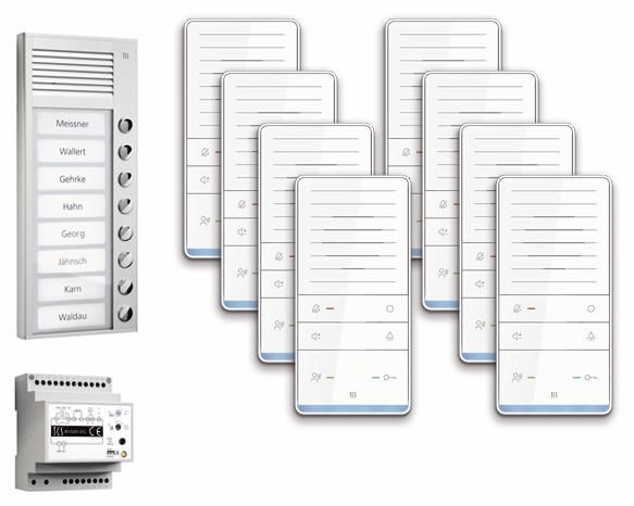 audio:pack PAAF081/001 for 8 residential units, article number: PAAF081/001, package description, audio:pack for 8 residential units, indoor station for hands-free calling, outdoor station for surface mounting, pre-configured TCS system components, scope of delivery, 1x outdoor station PAK08-EN, 8x door phone ISW5031-0145, 1x control unit BVS20-SG, hands-free speaker ISW5031-0145, product features, device type: TASTA hands-free speaker AUDIO PLUS WS, communication technology: TCS:BUS and video 2-wire:BUS, mounting type: surface mounting with TASTA mounting shell AP and via flush-mounted box, table mounting with separate table accessory ZIT5000-0030, number of acoustic call distinctions: acoustic call distinction between 2 front door calls, apartment door calls and internal calls, automatic call shutdown, automatic hands-free calling after internal call: Can be activated / deactivated with configo, hands-free talking / manually controlled two-way communication can be activated, conversation volume: volume button for adjusting the speech volume when a voice connection is established and for adjusting the ringtone volume when there is no voice connection, speech volume can be set by the user in 4 levels, busy indicator: optical busy indicator when a voice connection is established., privacy lock, call display: configurable. Optical display and short-term storage of door calls, ringtone mute: call-off button for switching off the ringtone with optical display and for ringtone selection mode and call forwarding display, ringtones: selection from 13 ringtones, adjustable by the user. Ringtone volume can be set by the user in 4 levels, internal call (number can be configured), number of parallel calls (indoor stations per door call): 1 parallel call can be set with configo, floor call possible: connection for floor button available on the device, light switching: light button, alternative to ringtone selection floor call and (de-)activation of ambient lighting, alternative programmable control function 9 or internal call 2, door opening: door opener button plus optical display, alternative to ringtone selection door call 1 from the outdoor station, with activatable floor door opener function, automatic door opener, floor door opener function: can be de-/activated with configo, error display: acoustic and optical error display for time-saving commissioning, functionally expandable: side slot with radio transmitter board for controlling radio signal device, commissioning and configuration: configo configuration software can be used for convenient system configuration on the PC with automatic recognition of device type and serial number, mounting plate: lower shell with plugged screw terminal can be pre-installed, activation of additional functions: function button from Factory assigned with control function / activatable alternative assignment internal call, automatic door opener, call forwarding and ring tone selection internal call / adjustable with configo, ambient lighting: as orientation light, can be deactivated or activated, as call display can be deactivated or activated, LED display: door opener display LED blue, LED (red): ring tone deactivation active (lit up),Call forwarding active (flashes), LED (green): call and speaking active (lights up), voice channel busy (flashes 3x), technical data, dimensions HxWxD (mm): 195x94x21, material/color: housing made of antistatic and recyclable plastic. Color: glossy white, UV resistance, permissible ambient temperature (°C): -5 °C to +40 °C, Protection class: