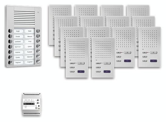 14x indoor station for hands-free 5 buttons WS, article number: ISW3030-0140, 1x Vers. + control unit BVS20 1 line 4TE, article number: BVS20-SG, The package is pre-configured at the factory and can be expanded to a limited extent, The functions of the indoor and outdoor stations can be changed to a limited extent with TCS service products, The components support stand-alone operation
