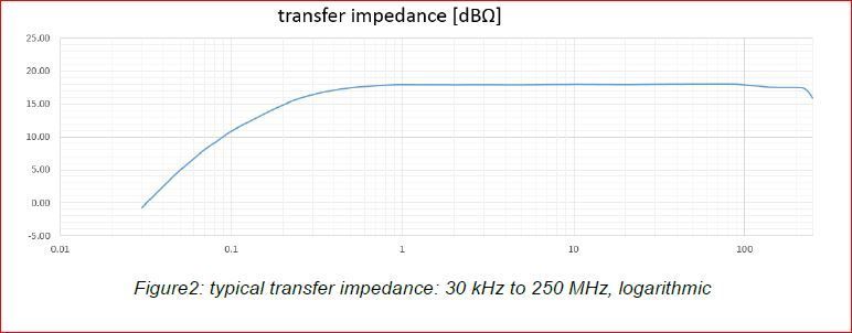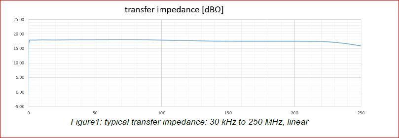 The probe has a very flat response with a 3dB bandwidth of 250 MHz and is characterized and usable over the frequency range from 30kHz to 250 MHz. The aperture of the RF current monitoring probe is 25mm. Its transmission impedance is