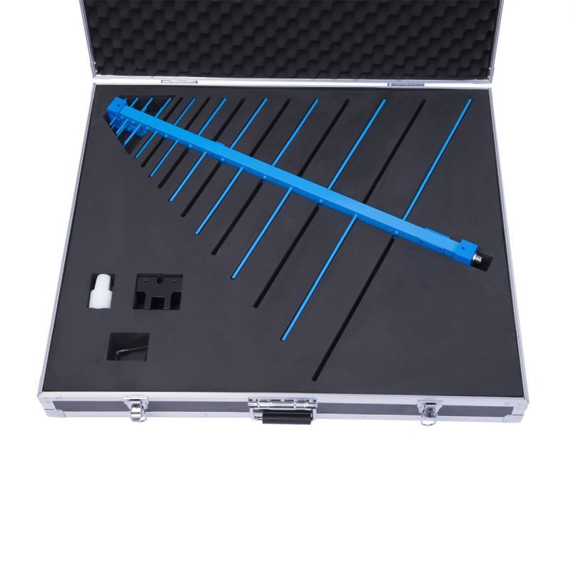 The TBMA3 is an affordable log-periodic measurement antenna aimed at radiated noise EMC pre-compliance testing. The TBMA3 is characterized from 250 MHz to 1.3 GHz and has VSWR and antenna factor values typical of log-periodic measurement antennas. CISPR 16 divides the frequency range into several bands and defines specific antennas for each of these bands. For the frequency range above 300 MHz to 1 GHz, CISPR 16 requires the use of log-periodic antennas (log-periodic antennas) for radiated noise measurements. The TBMA3 is a medium-sized logarithmic-periodic antenna with its radiating elements and supporting booms made of powder-coated aluminum alloy. It is equipped with a standard N socket and is supplied together with an antenna bracket and a mounting adapter. A standard ¼ inch thread on the bottom of the mounting adapter makes it easy to connect to most standard tripods. The TBMDA3 comes in a sturdy carrying case as pictured above.