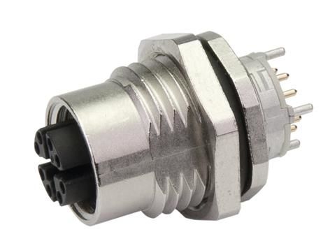 Design: 8-pin, X-coded, straight, one-piece, 4-way shield connection, THR solder connection, 6.7 mm distance to the circuit board, installation from the rear