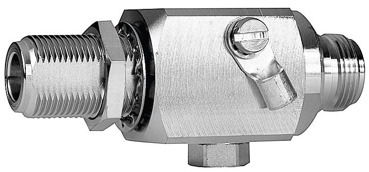 Lambda/4 short-circuit types: With surge arresters of this type, a direct, massive short circuit is switched between the inner and outer conductors. The length and shape of this short circuit are designed exactly so that certain frequencies are back in phase with the signal frequency to be transmitted after total reflection. This means that all frequencies outside the defined frequency range are short-circuited and diverted. The advantages of this series are the very high leakage currents (> 100 kA, 8/20 pulse), the absolute freedom from maintenance and the suitability for intermodulation-sensitive applications. Special versions that allow the transmission of direct voltage for the power supply of antenna preamplifiers via the coaxial cable are also available.