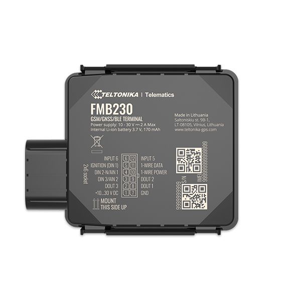 Featuresip67 - Classifies the level of protection against solid objects and water Configurable DIN/AIN/NIN for flexible remote monitoring and control. CAN data reading from vehicles and special transport (with CAN adapter) Bluetooth for external devices and low energy sensors Pulse inputs for data reading from fuel flow meters Battery - allows the device to be operated without an external power source Scope of delivery1 x Teltonika FMB230 GPS Tracker 1 x Manual For technical data see data sheet !
