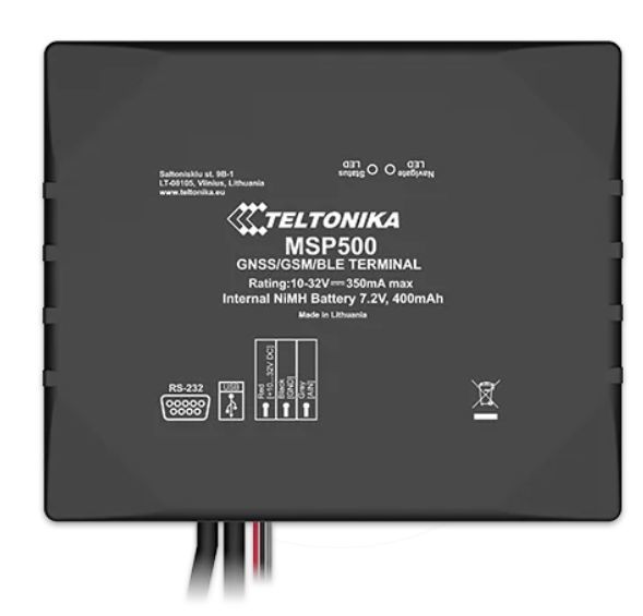 FeaturesRS232 is an industry standard for serial communication Integrated buzzer External voltage range Allows the device to operate without an external power source Allows the device to limit the vehicle speed Bluetooth for exchanging data over short distances Scope of deliveryTeltonika MSP500 Tracker Manual Technical data see data sheet!!