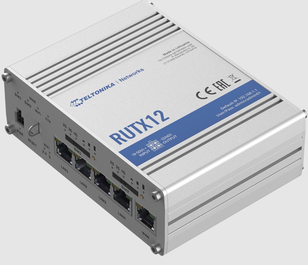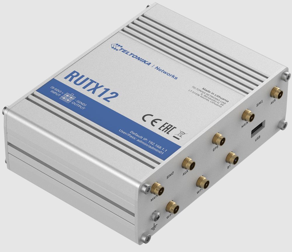 We offer you Teltonika · Router · RUTX12 · Dual LTE CAT6 Router WLAN, Dual Band WiFi (Wave-2 802.11ac), 2 SIM always at the best possible price. We can give you a discount of 2% on Teltonika · Router · RUTX12 · Dual LTE CAT6 Router WLAN, Dual Band WiFi (Wave-2 802.11ac), 2 SIM if you choose payment in advance on ordering.