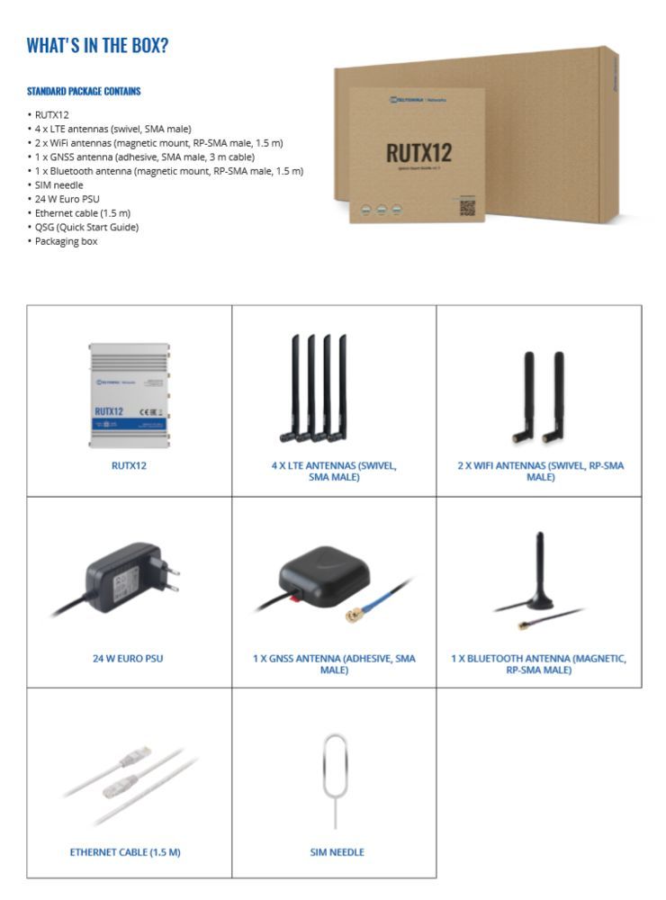FeaturesDUAL-LTE - Cellular speeds of up to 600 Mbps with two simultaneous LTE CAT 6 connections DUAL-SIM - Instant failover switching Wi-Fi and Bluetooth - Wave-2 802.11ac dual-band Wi-Fi and Bluetooth LE GNSS - Global Satellite-based navigation system for location services and time synchronization Load balancing - Allows the use of multiple WAN sources to increase throughput RMS - compatible with Teltonika Remote Management System Scope of delivery1 x Teltonika RUTX12 4 x LTE antennas 2 x WIFI antennas 1 x GNSS antenna 1 x Bluetooth antenna 1 x 24W EU Power supply 1 x Ethernet cable 1 x SIM PIN For technical data see data sheet!