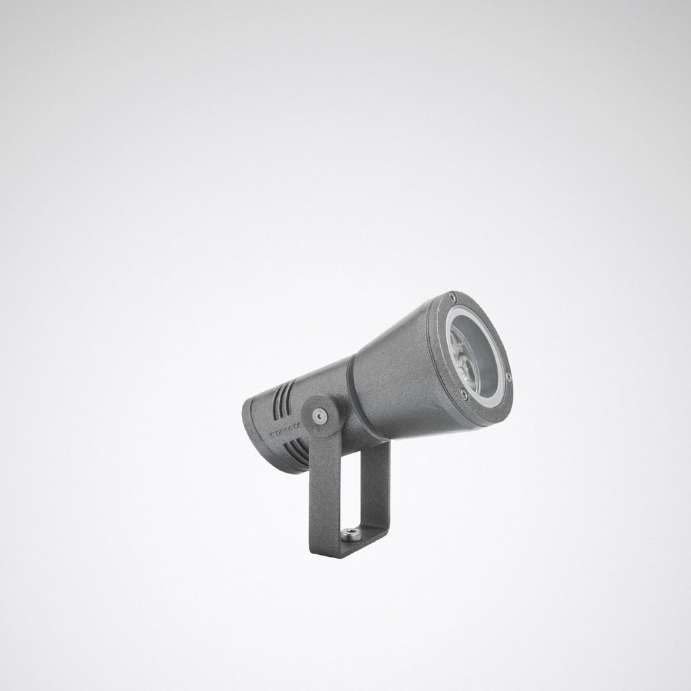 Compact spotlight for accent lighting. The luminaire is part of a series with variants that cover different lighting requirements with the same luminaire design. For direct installation on a solid surface. With ground spike (accessory) suitable for fastening in the ground. Mast fastening using stainless steel mast clamp (accessory). Clamping range Ø 40-130 mm. With rotationally symmetrical, deep beam light distribution. Maximum light intensity in beam angle 2 x 3°. Luminaire luminous flux and light color fixed. With LED lens system. Number of LEDs: 3. Rated luminous flux 500 lm, rated power 6 W, maximum luminaire luminous efficacy 83 lm/W. Light color neutral white, correlated color temperature (CCT) 4000 K, general color rendering index (CRI) Ra > 80. Color location tolerance (initial MacAdam) = 4 SDCM. Other LED light colors available on request. Average rated service life L80(tq 35 °C) = 50,000 h. The light source is replaceable in accordance with the ecodesign requirements (Regulation (EU) 2019/2020). Spotlight housing made of die-cast aluminum. Surface anthracite coated (DB 703). With metallic effect, highly weather-resistant. On request, the luminaire body can be made in the following colors at no extra cost: Black textured (Akzo Nobel 8118669, similar to RAL 9005, V5), white textured (Akzo Nobel 8158870, similar to RAL 9016, V6), gray textured (Akzo Nobel 8129595, similar to RAL 9006, V7). Other color variants according to RAL or DB color code are available on request for an additional charge. Rotatable and pivotable, pivot range 195°, pivot range 360°. With flat cover panel, extra-clear, 4 mm. Protection class (EN 61140): I, protection type (DIN EN 60529):