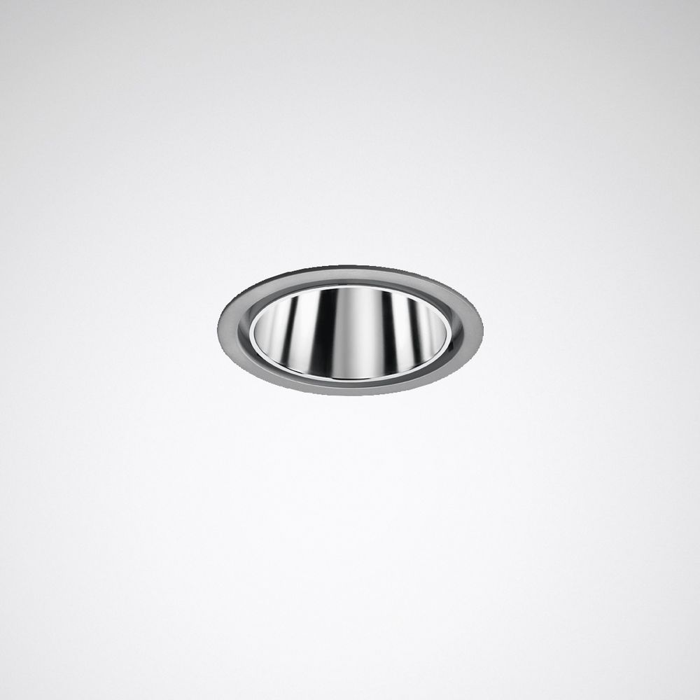 IP54 is achieved on the room side. High-gloss anodized aluminum reflector. With symmetrical, wide-beam light distribution. Luminaire luminous flux and light color are fixed. Equipped with an LED spot module. Rated luminous flux 1800 lm, rated power 16 W, maximum luminaire luminous efficacy 113 lm/W. Light color neutral white, correlated color temperature (CCT) 4000 K, general color rendering index (CRI) Ra > 80. Color location tolerance (initial MacAdam) = 3 SDCM. Average rated service life L80(tq 25 °C) = 70,000 h, average rated service life L85(tq 25 °C) = 50,000 h. The light source is replaceable in accordance with the ecodesign requirements (Regulation (EU) 2019/2020). Luminaire body made of die-cast aluminum. Surface coated silver gray (RAL 9006). External dimensions of ceiling ring Ø 150 mm, luminaire height 103 mm. Luminaire and heat sink form a compact unit. Permissible ambient temperature (ta): -20 °C - +25 °C. Protection class (EN 61140): II, protection type (DIN EN 60529):