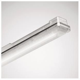 IP 66 for use in applications with high demands on variability, efficiency, light quality and technology. The luminaire is part of a range with identical, technically compatible variants. These variants are available with alternative optical systems, light engines with adjustable luminous fluxes and with connection options to light management and emergency lighting systems. Suitable for use in HACCP, IFS and/or BRC Global Standard Food certified companies. With limited surface temperature, suitable for use in fire-hazardous rooms in accordance with DIN EN 60598-2-24. With clipless locking technology for easy installation of the diffuser cover and luminaire body in accordance with the protection class after connection. Suspended installation possible using optional accessories. Ceiling mounting using the enclosed stainless steel fastening clip. Suspended installation possible using optional accessories. With a prismatic, photometrically effective, translucent PC cover, direct beam. With symmetrical, extremely wide beam light distribution. Direct beam with decorative indirect component. Distribution of the luminaire luminous flux indirect/direct component 85% / 15%. Luminaire luminous flux adjustable in 16 levels. Rated luminous flux 2400 lm - 7800 lm, rated power 17 W - 58 W, maximum luminaire luminous efficacy 141 lm/W. Light color neutral white, correlated color temperature (CCT) 4000 K, general color rendering index (CRI) Ra > 80. Color location tolerance (initial MacAdam) = 3 SDCM. Average rated service life L80(tq 25 °C) = 70,000 h, average rated service life L80(tq 35 °C) = 50,000 h. The light source is replaceable in accordance with the ecodesign requirements (Regulation (EU) 2019/2020). The basic setting when delivered corresponds to that of the smallest adjustable luminaire luminous flux. Luminaire body color light gray (RAL 7035). Dimensions (L x W): 1552 mm x 102 mm, luminaire height 91 mm. Permissible ambient temperature (ta): -30 °C - +35 °C. Protection class (EN 61140): I, protection type (DIN EN 60529):