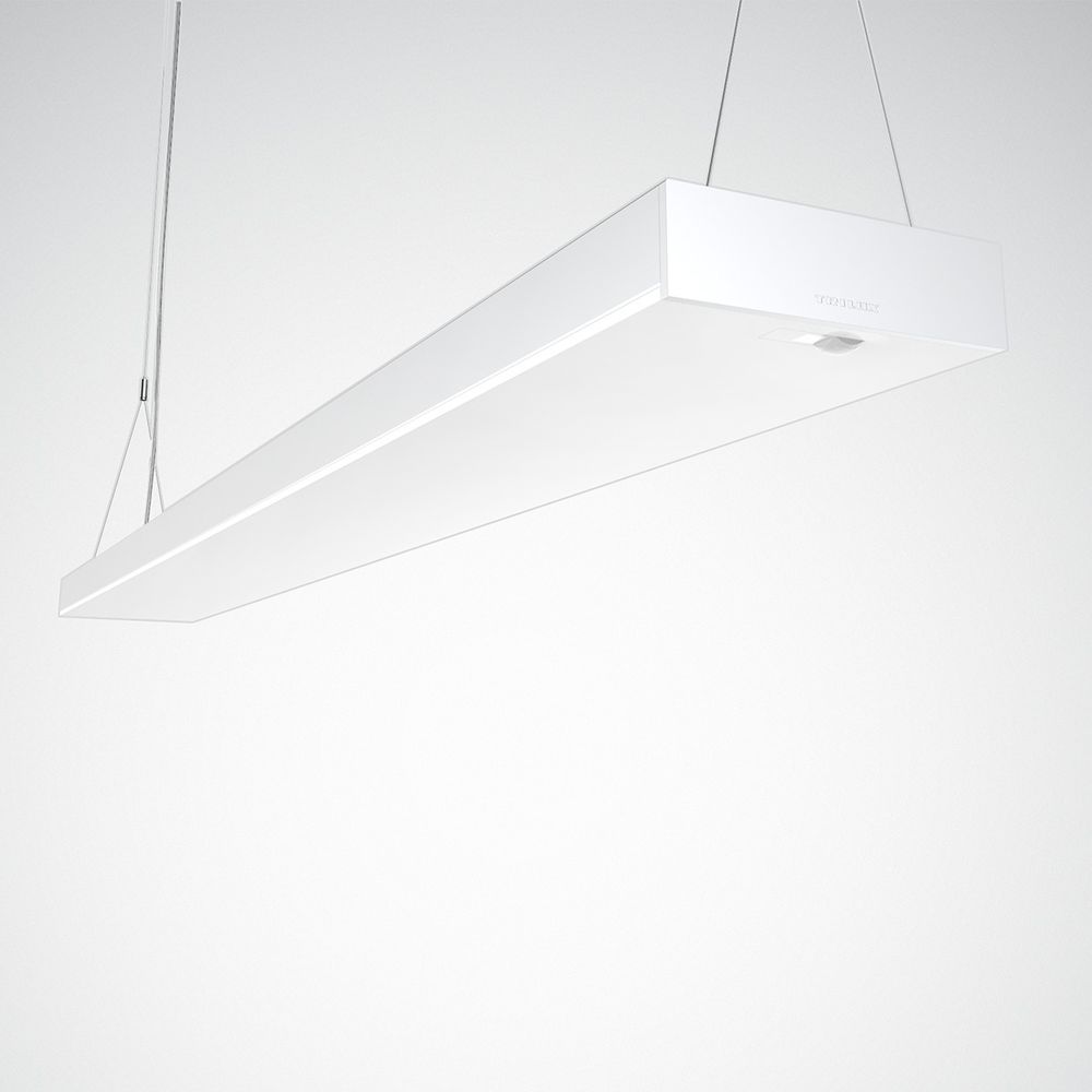Rectangular LED pendant light, direct-indirect beam, with full-surface, rimless PMMA cover. With integrated LiveLink WiFi control unit and LiveLink sensor for daylight-dependent control and presence detection as well as WLAN module for secure commissioning and operation (WPA2 encryption). Predefined room configurations (use cases) with all planning-relevant data enable simple and quick commissioning. Control of up to 64 DALI participants. Commissioning is carried out using the LiveLink Install commissioning app for tablet PCs. LiveLink sensor Tridonic MSensor G3 PIR 5DPI for daylight-dependent control and presence detection. Constant light control with switch-off function when there is sufficient daylight. Passive infrared presence sensor, with highly sensitive multi-segment pyro sensors, with adjustable switch-off delay time, optionally in automatic mode (automatic on, automatic off) or semi-automatic mode (automatic off, manual on). Special IQ mode for automatically adjusting the follow-up time to the use of the room. Connection and electrical supply via the DALI interface of the LiveLink control unit. Number of occupied DALI participants: 5. Detection range: Ø 4.5 m, installation height 2.5 m - 5 m. Suitable for use in HACCP, IFS and/or BRC Global Standard Food certified companies. For single or light strip applications using accessories that must be ordered separately. Suitable for through-wiring. With an internal microprismatic cover panel and a smooth, opal PMMA cover on the room side. With symmetrically limited wide beam light distribution. Glare rating according to UGR classification (EN 12464-1) 80. Color location tolerance (initial MacAdam) = 3 SDCM. Average rated service life L80(tq 25 °C) = 50,000 h. The light source is replaceable in accordance with the ecodesign requirements (VO (EU) 2019/2020). Luminaire body made of sheet steel. Surface coated white (RAL 9016). Dimensions (L x W): 1408 mm x 160 mm, luminaire height 47 mm. Protection class (EN 61140): I, protection type (DIN EN 60529):