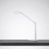 Compact table lamp with a flat, round lamp head, three adjustment joints and base. The lamp is controlled via the controls on the lamp head. Suitable for illuminating an RF3 area according to DIN 5035-8 with up to 500lx without additional lighting. In conjunction with general lighting (500lx), modified illuminance levels according to DIN EN 12464-1:2021 of up to 1000lx are achieved on the RF3 area for office-specific visual tasks. With base plate for setting up on a flat surface. The base plate is fully lined with felt to protect the base. The vertical joint on the lamp base enables the lamp head to be rotated by 120°. With prismatic cover for optimal light distribution. With asymmetrical wide beam light intensity distribution. Luminaire luminous flux and light color fixed. Rated luminous flux 700 lm, rated power 7.7 W, maximum luminaire luminous efficacy 91 lm/W. Light color neutral white, correlated color temperature (CCT) 4000 K, general color rendering index (CRI) Ra > 90. Color location tolerance (initial MacAdam) = 3 SDCM. Average rated service life L80(tq 25 °C) = 50,000 h. The light source is replaceable in accordance with the ecodesign requirements (Regulation (EU) 2019/2020). Luminaire body made of die-cast aluminum. Surface coated white (RAL 9016). Dimensions of the base plate: Ø 190 mm x 10 mm. Dimensions of the luminaire head Ø 134 mm x 23 mm, luminaire height (continuously adjustable) 390 mm - 715 mm. Protection class (EN 61140): II, protection type (DIN EN 60529):
