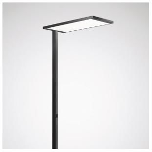 Exclusive LED floor lamp with direct and indirect luminous flux components. For standard-compliant illumination of single and double workstations. With integrated passive infrared presence detector and daylight sensor. In terms of design and lighting properties, the floor lamp harmonizes with hanging and surface-mounted lamps as well as other floor lamp variants in the project. The lamp is delivered in 4 packages to protect the individual components. The direct component of the lamp, with its wide, slightly asymmetrical light intensity distribution, ensures very even illumination of the desk surface. The indirect component with Lambertian light distribution ensures optimal room illumination. With symmetrically limited wide beam light intensity distribution. Glare rating according to UGR classification (EN 12464-1) 80. Color location tolerance (initial MacAdam) = 3 SDCM. Average rated service life L80(tq 25 °C) = 50,000 h. The light source is replaceable in accordance with the ecodesign requirements (Regulation (EU) 2019/2020). Luminaire body made of extruded aluminum profile and die-cast aluminum. U-shaped luminaire base. Inclination of the luminaire head can be adjusted lengthwise and crosswise using two grub screws. Surface coated in black (RAL 9005). Other colors available on request. Luminaire height: 2000 mm, length / width of base: 500 mm / 320 mm, length / width of luminaire head: 677 mm x 290 mm, height of luminaire head: 23 mm. Standpipe dimensions: 50 mm x 28 mm. Protection class (EN 61140): I, protection type (DIN EN 60529):