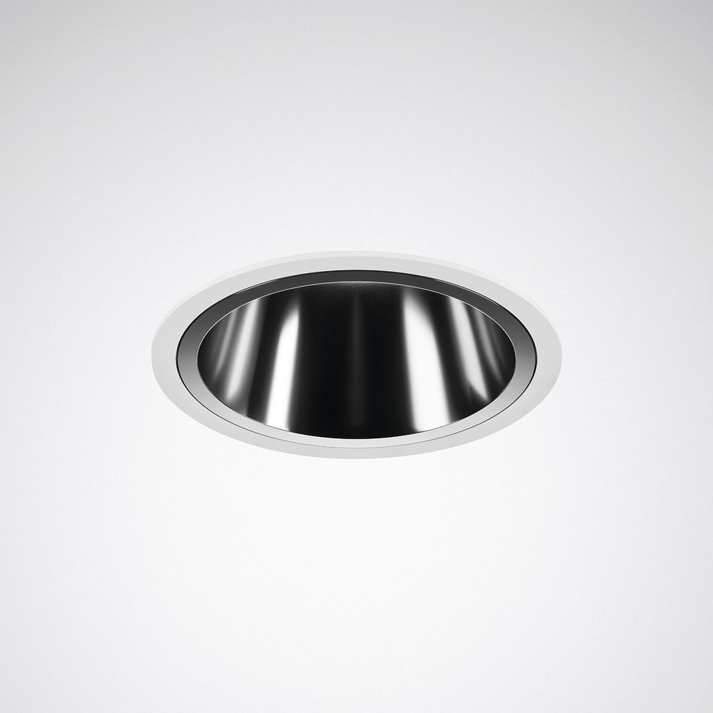 Compact LED downlight in a round design. Recessed downlight with edge for sawn ceiling openings. Tool-free ceiling installation using quick-assembly clamps. Ceiling cutout size Ø 210 mm. Renovation panels for installation in existing ceiling openings with unsuitable dimensions are available as accessories that must be ordered separately. Installation depth >= 127 mm, luminaire height 130 mm. With high-gloss vapor-coated plastic reflector. Color of the ceiling installation frame: white. Symmetrical light distribution characteristics and half-value angle: 60° Very Wide Flood. Light control using collimator/lens technology. Limitation of direct glare in accordance with UGR 19. With one LED module. Luminaire luminous flux 3,800 lm, connected load 33.0 W, luminaire luminous efficacy 115 lm/W. Light color warm white, correlated color temperature (CCT) 3000 K, general color rendering index (CRI) Ra = 80. Color tolerance (initial MacAdam) = 3 SDCM corresponds to a very high color uniformity of the LED in the application. Average service life L90 (tq 25 °C) = 50,000 h, average service life L80 (tq 25 °C) = 100,000 h. The light source is replaceable in accordance with the ecodesign requirements (Regulation (EU) 2019/2020). Permissible ambient temperature (ta): -20 ° C - + 25 ° C. Housing and heat sink made of die-cast aluminum. Protection class (EN 61140): II, protection type (DIN EN 60529):