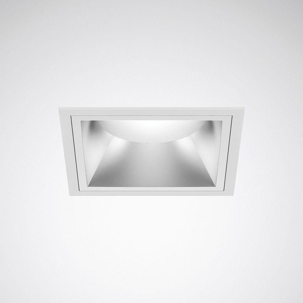 Compact LED downlight in a square design. Recessed downlight with edge for sawn ceiling openings. Tool-free ceiling installation using quick-assembly clamps. Square ceiling cut-out size 150 mm. Installation depth >= 130 mm, luminaire height 133 mm. With matt glossy vapor-coated plastic reflector. Color of the ceiling installation frame: white. Symmetrical light distribution characteristics and half-value angle: 60° Very Wide Flood. Light control using collimator/lens technology. Limitation of direct glare in accordance with UGR 19. With one LED module. Luminaire luminous flux 1,400 lm, connected load 11.0 W, luminaire luminous efficacy 127 lm/W. Light color neutral white, correlated color temperature (CCT) 4000 K, general color rendering index (CRI) Ra = 80. Color tolerance (initial MacAdam) = 3 SDCM corresponds to a very high color uniformity of the LED in the application. Average service life L90 (tq 25 °C) = 50,000 h, average service life L80 (tq 25 °C) = 100,000 h. The light source is replaceable in accordance with the ecodesign requirements (Regulation (EU) 2019/2020). Permissible ambient temperature (ta): -20 ° C - + 25 ° C. Housing and heat sink made of die-cast aluminum. Protection class (EN 61140): II, protection type (DIN EN 60529):