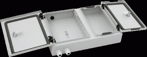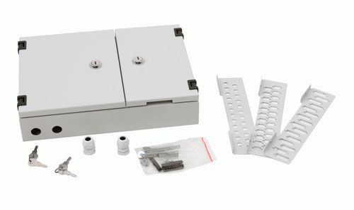 The larger part is intended for the incoming and outgoing fiber optic cables and is equipped with a holder for a splice cassette. The cables enter this area through the housing jacket and are sealed in bushings. The smaller area is intended for cable connection using patch cords and couplings. The couplings are installed on the middle partition. Since the connector type is usually not known in advance, 3 partitions for the most common connectors are part of the housing (for 24xST, 24x SC and 16x SC-Duplex couplings). Both sections are protected against ingress of dust by a PUR foam seal on the door and a special frame construction. The smaller area can be used as a passageway (i.e. for cables leading out through the gap under the door to the next component) or completely dust-tight and enclosed. This depends on the modules used, which are included in the accessory pack for both variants.