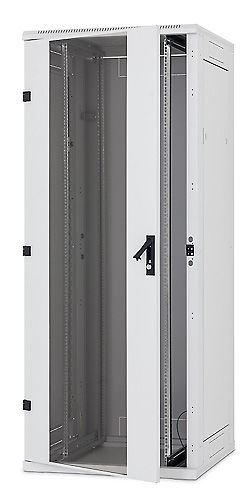 Description: Welded standing cabinet for a load of 1200 kg, expandable up to 1500 kg in sheet steel design, IP 30. Air slots on the side in the roof (ventilation dome) and base part. Covered cable ducts and mounting locations for the ventilation unit in the roof and floor parts. All parts grounded together, two pairs (three pairs for cabinet depths of 900 mm and above) 48,3 cm ( 19 inch ) vertical mounting rails, galvanized, adjustable. All height units marked on the mounting rails. In the accessory pack: 16 cage nuts with screws and washers, 4 leveling feet, brush strip set
