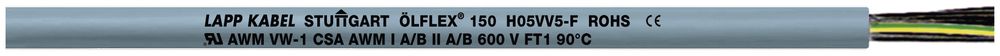 Control cable ÖLFLEX® 150 18G1, control cable, 18G1, U0/U: 300/500 V, PVC, core identification: numbers, UL recognized, H05VV5-F, flexible, areas of application: suitable for medium mechanical stress, can be used in dry, damp and especially in oily environments, for fixed installation and occasional movement without tensile stress, PVC outer sheath is resistant to acids and alkalis, can be used universally for wiring of machine-internal and system-wide control circuits, benefits: manufactured according to the harmonized European design H05VV5-F, with HAR" marking for tested safety and quality, increased oil resistance according to DIN EN 50363-4-1 (TM5), cable with multiple certification enables universal use, reduces the variety of parts and thus ensures savings in logistics, "HAR cables in Europe widely accepted and applicable,Tested resistance to ECOLAB® disinfectants and cleaning agents,UL/CSA certification according to technical data enables use of the product in North America