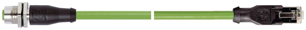pre-assembled Ethernet cable IE-PNB-5-M12D-A-20-Y-2-22-7-RJ45, pre-assembled Ethernet cable, flexible, fixed installation, PROFINET, ETHERNET/IP, PROFINET® Application: Type B, Cat.5, SF/UTP, polyvinyl chloride, 2x2, M 12 (D-coded), plug, angled (90 °), RJ 45, plug, straight (180 °), 20 m, Areas of application: Suitable for medium mechanical stress, Also suitable for EtherCAT and EtherNet/IP applications, Can be used in dry and damp rooms, For flexible use in the PROFINET network (Type B), due to the stranded conductor structure, PVC outer jacket is resistant to acids and alkalis and conditionally oil-resistant, Benefits: Cat5 performance up to 100 Mbit/s, UL certification according to technical data enables use of the product in North America,The angled shape of the connector is ideal for space-saving cable outlets,Fast information exchange thanks to Ethernet technology,Tested resistance to ECOLAB® disinfectants and cleaning agents (only applies to the cable),Available as a single-sided pre-assembled connection cable for flexible determination of the cable length and free choice of further connection,Also available with pre-assembled flange coupling for easy routing through control cabinet walls,Increased resistance to electromagnetic interference thanks to stranding as a star quad and double shielding made of aluminum-clad foil and copper shielding braid with a high degree of coverage (SF/UTP),Also available as a cable pre-assembled on both sides to save time during installation,Integrated vibration protection of the connector makes it insensitive to shock and vibration