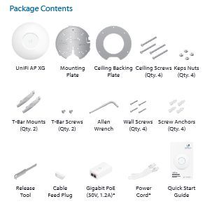 UniFi AP (50 V, 1.2 A)* Power cord * Only included in the UAP-XG single pack. Technical data: Product name: Ubiquiti UniFi WiFi System UAP-XG Dimensions: 228 x 228 x 50 mm Weight: 1.20 kg Antennas/Antennas: 4x dual-band antennas Data throughput 2.4GHz: max. 450Mbps Data throughput 5GHz: max. 1700Mpbs Max TX Power: 2.4GHz 25dbm 5 GHz 25dbm Wifi standard: 802.11 a/b/g/n/ac/ac w2 Network: 1x 10/100/1000 Ethernet ports (1) 1/10 Gbps ICM Ethernet port Certificates: FCC , IC, CE Power consumption: 31W Mounting: Wall mounting kit Power supply: 50V, 1.2A PoE Gigabit adapter Power supply: Operating temperature: -10°C to +60°C