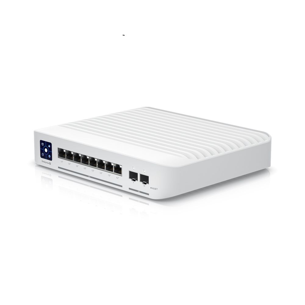 The Switch Enterprise 8 PoE (USW Enterprise 8 PoE) is a managed Layer 3* switch with (8) 2.5 GbE, 802.3at PoE+ RJ45 ports and (2) 10G SFP+ ports. The USW Enterprise 8 PoE also features a 3,3 cm ( 1,3 inch ) LCM color touchscreen that displays important system and connection information. This switch can be monitored or configured from anywhere using the powerful, intuitive UniFi Network web application and mobile app .