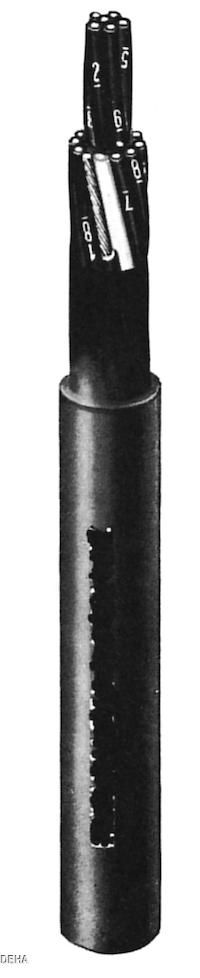 Control cable for control devices on machine tools, assembly lines, conveyor systems, in plant construction, etc. Suitable for fixed installation and flexible use, with free movement without tensile stress and without forced movement guidance under medium mechanical stress. The control cable can be used in dry, damp and wet rooms.Structure: