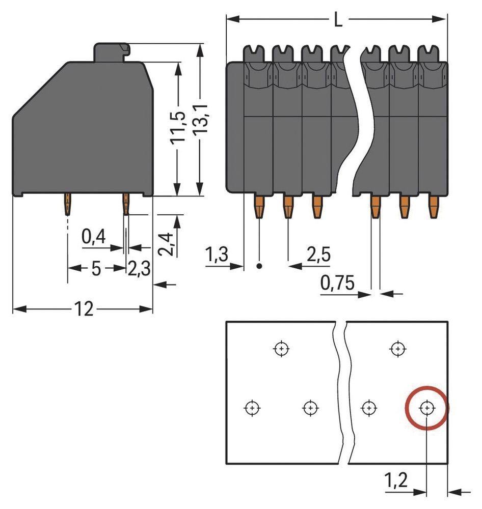 WAGO 250-408/353-604 THR PCB terminal, pusher, 0.5 mm², pitch 2.5 mm