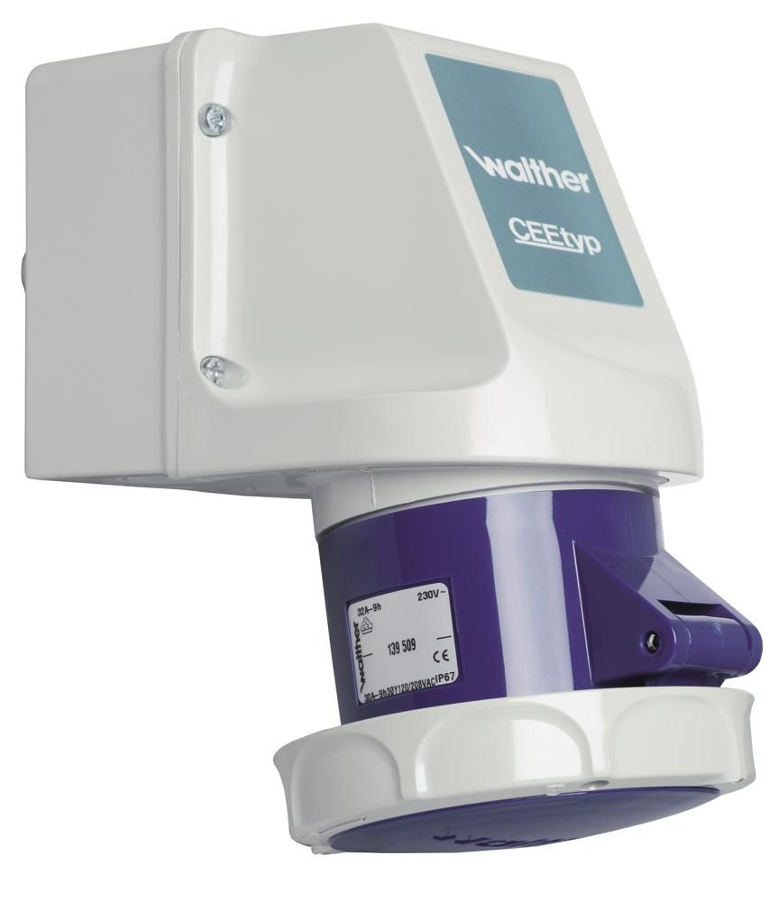 Walther wall socket 16A 5P 230V 9h IP67 internal fitting. Cable entry 2 above
