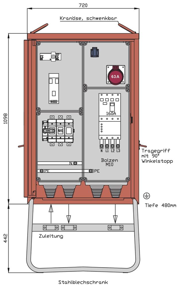 Walther distribution cabinet 111kVA RCD type A CEE outlet 63A 1 Schuko