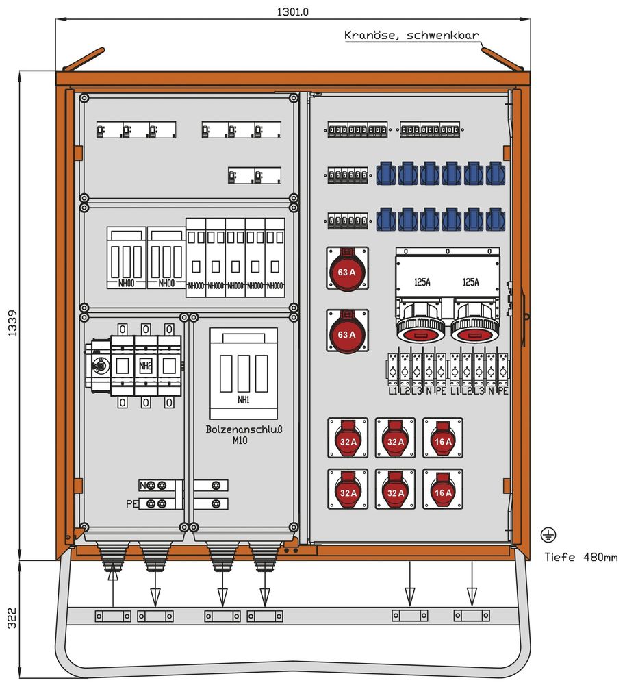 Walther distribution cabinet 246kVA 4 RCDs type B 4 RCDs type A 18 LS 10