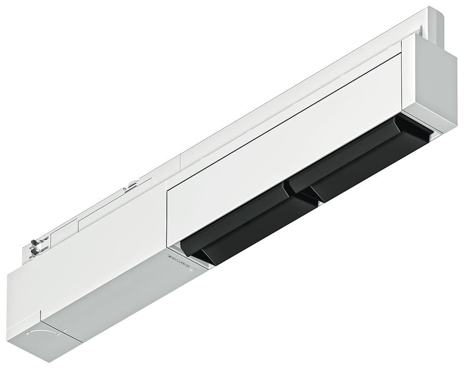Compact, linearly pivoting LED spotlight as a wallwasher with patented, miniaturized free-form reflector technology liteCarve(R), for brilliant and evenly asymmetrical illumination of vertical surfaces, starting from an LED point light source, the liteCarve(R) reflector directs the light 100% indirectly, specifically and without stray light onto the vertical surface, linear light head pivotable on the track (+/-90°) or pivotable in the U or H channel profile or flush-mounted installation (+/-25°), with 6 miniaturized individual light heads in a linear arrangement, luminaire with L3+DALI universal adapter for DALI control with operating device in the adapter (for 3-phase/L3+DALI track), only connection with LDE or LDO, with protective conductor on the right (WWB), fitting: 21W LED900-930, WALLWASHER beam characteristic (PE right), reflector: silver with black decorative edge, high gloss, color rendering Ra > 90, color temperature 3000 K (warm white), color tolerance (initial MacAdam): 2, luminaire luminous flux: 899 lm, luminaire luminous efficacy: 43 lm/W, service life: 50000h at 90% luminous flux, with control gear, DALI controllable luminaire (DALI only), passive cooling through innovative heat management, spotlight housing made of die-cast aluminum, painted white, reflector unit made of polycarbonate (PC) 2-part: head aluminum sputtered, high gloss / base square with decorative edge, luminaire wired halogen-free, luminaire power: 21 W, mains voltage: 220-240V/ 50/60Hz, dimensions: 398x35x83 mm, weight: 0.74 kg, note: different color combinations (design personalization) of the individual components as a variant via mySUPERSYSTEM INTEGRAL can be ordered, Note: Optimal distance between the luminaire and the illuminated vertical surface: 1/3 of the installation height, Note: Horizontal and vertical wall mounting permitted, not suitable for point outlet!