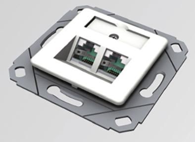 The designable module holder consists of a zinc die-cast frame. It is suitable for installation in a cable duct (EK), for flush-mounting (UP) or, using a separate frame, for surface mounting (AP). By breaking away two mounting brackets, floor tank mounting (BT) is also possible. The design-capable data socket can be combined with almost all switch programs available on the market. Sales unit: 1 ST.