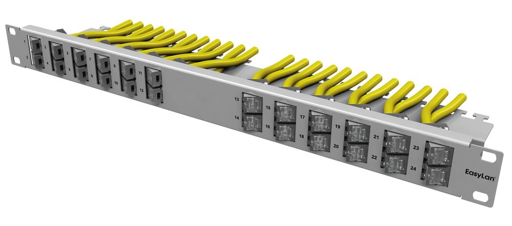 With the preLink®/fixLink® angle panel, the user has the option of snapping 24 keystone modules into the panel at an angle of 30°, so the connected patch cables automatically run to the side of the cabinet and only have to be sideways be attached next to the patch level. The user can do without additional marshalling panels for cable routing. During operation, the angle panels with the flat front and the slanted patch cables also require less space at the front than conventional patch panels with vertically installed ports. The mounting material and the keystone modules are not included in the scope of delivery. Sales unit: 1 ST.