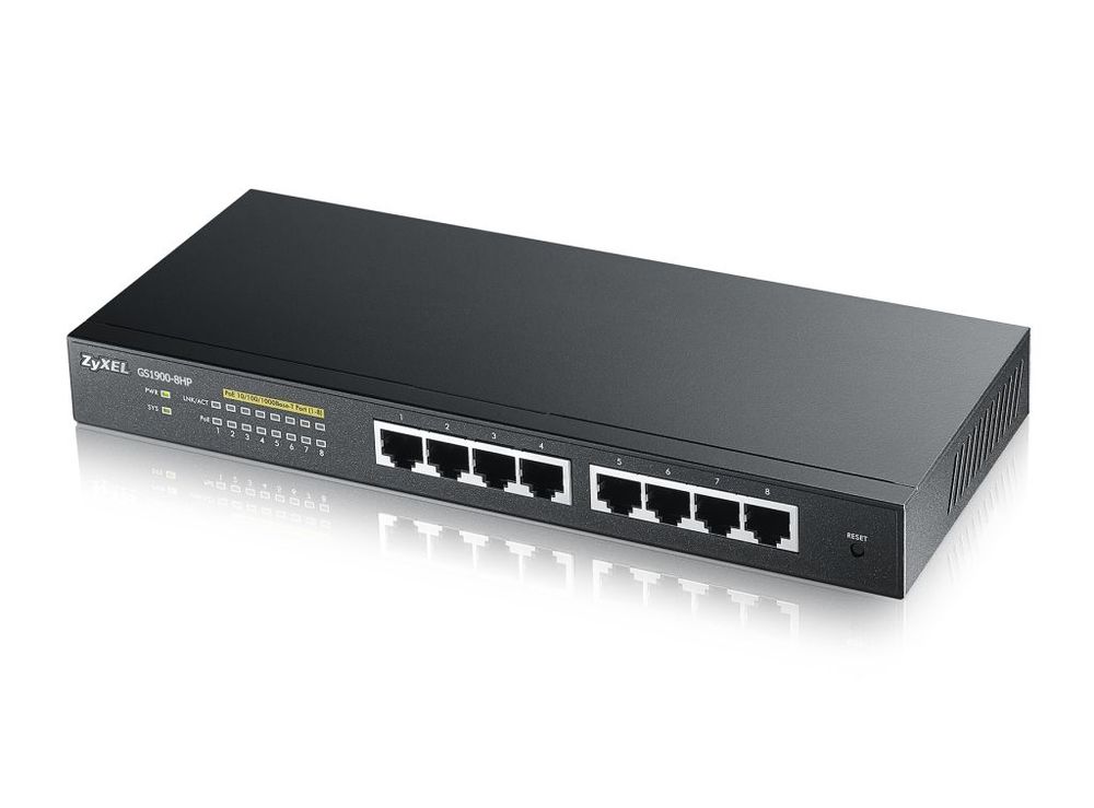 Zyxel Switch smart managed Layer2 8 Port? 8x 1GbE? PoE budget 77 watts? 8x PoE at ? Desktop? Fanless? GS1900-8HP V3