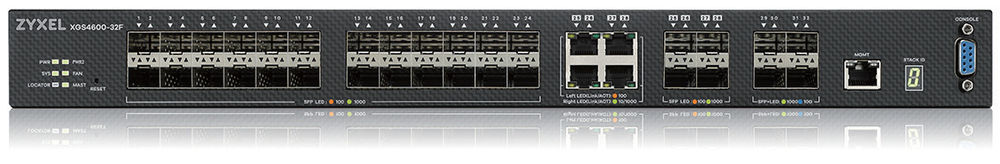 XGS4600-32F 10 GbE SFP+ slots Provides high-bandwidth with true physical stacking of up to 4 units and 112 Gigabit ports High resiliency with redundant power supply units